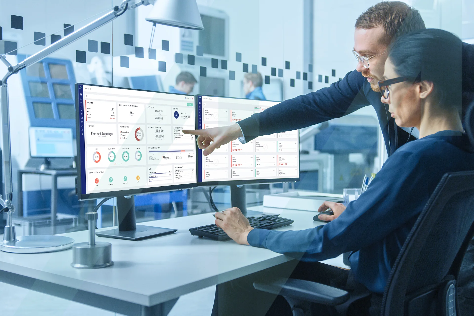 Real-time monitoring screens showing OEE, downtime, production status, and performance trends across all lines.