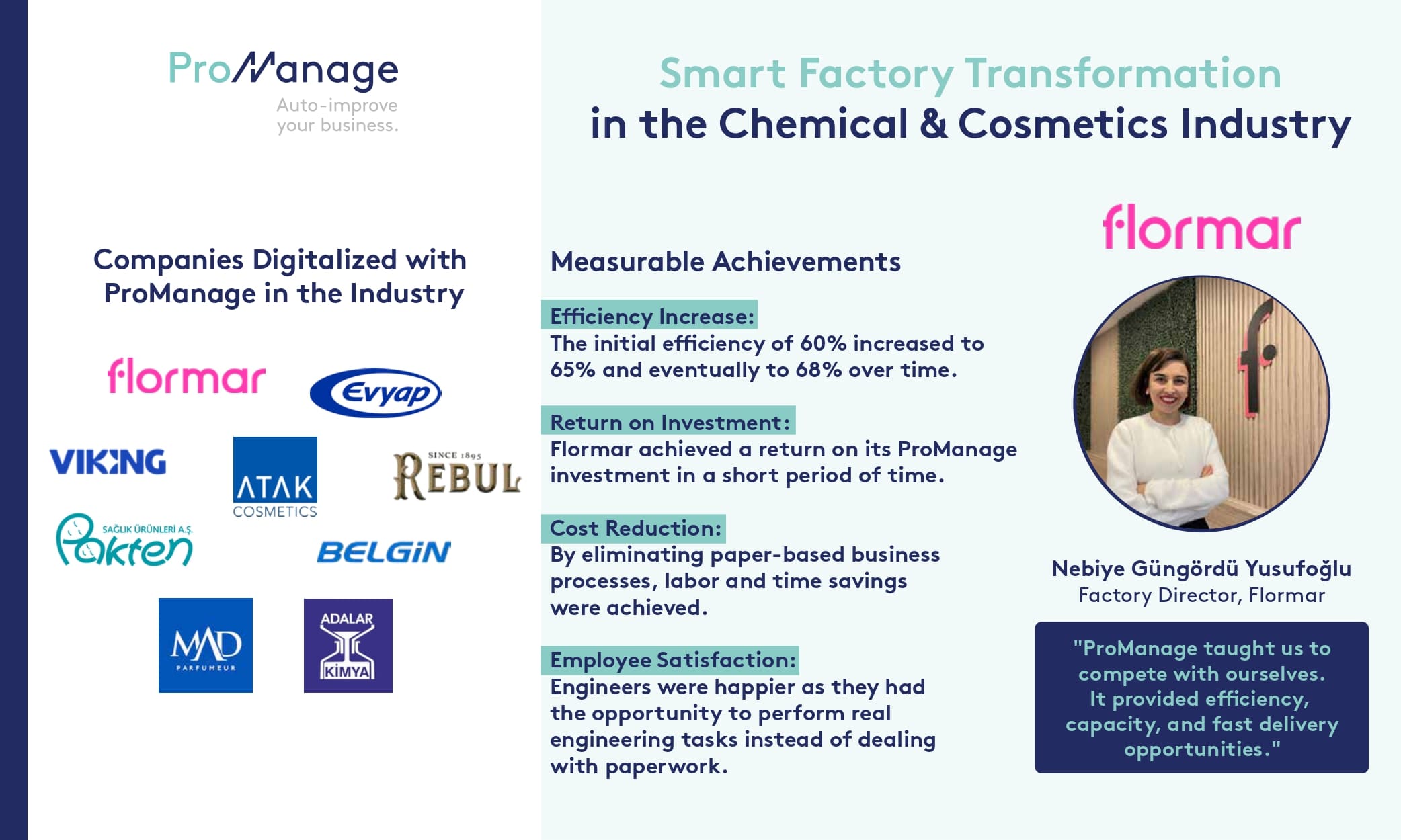 Born in Milan in the 1950s and nurtured by the inspiration of Turkey’s multicultural heritage, Flormar is a global cosmetics giant operating in over 70 countries with more than 500 stores. Bringing color to women’s lives with the motto “Happiness is your color,” the brand offers high-performance products in a vast color palette while utilizing clean ingredients and recycled materials in line with its sustainability vision. To make this massive FMCG-driven manufacturing operation more efficient, agile, and traceable, Flormar embarked on its digital transformation journey in 2016 by successfully implementing ProManage MES across its production lines.