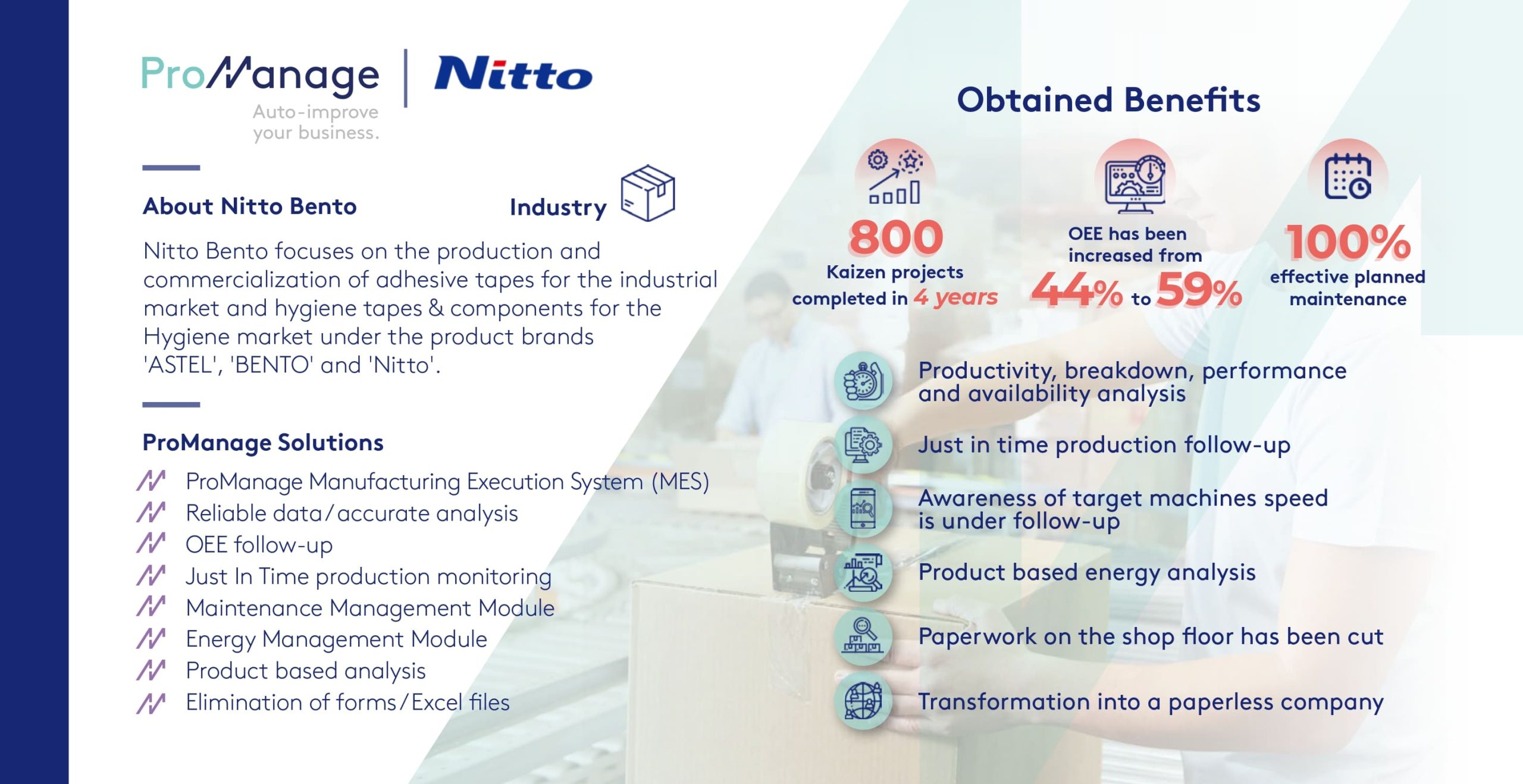 Nitto Bento produces tapes used in industrial and healthcare areas, and window and exterior profiles. Nitto Bento, which achieved significant gains in manpower, energy efficiency and machine performance by initiating digital transformation with ProManage, expanded its service area and increased OEE data from 40% to 60% and to 85% in critical machines.